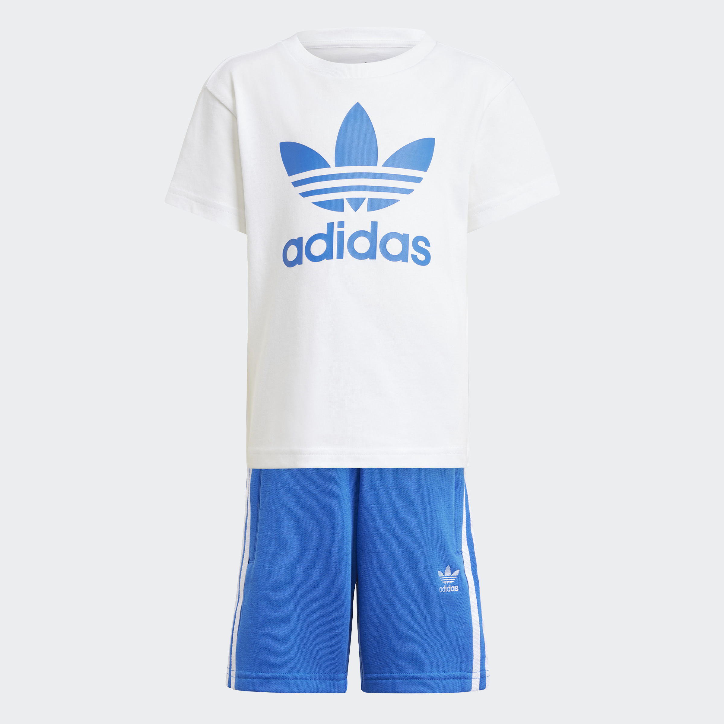 This kids' adidas shorts and tee set features a soft cotton single jersey build and a drawcord elastic waist for all-day comfort. From the oversized Trefoil on the chest to the 3-Stripes running down the legs its rooted in sport and style. Destined to become a go-to warm-weather outfit, this casual set is an everyday all-in-one outfit that's ready when they are. The cotton in this product has been sourced through Better Cotton. Better Cotton is sourced via a chain of custody model called mass balance. This means that Better Cotton is not physically traceable to end products. Find out more here: https://bettercotton.org/who-we-are/our-logo/