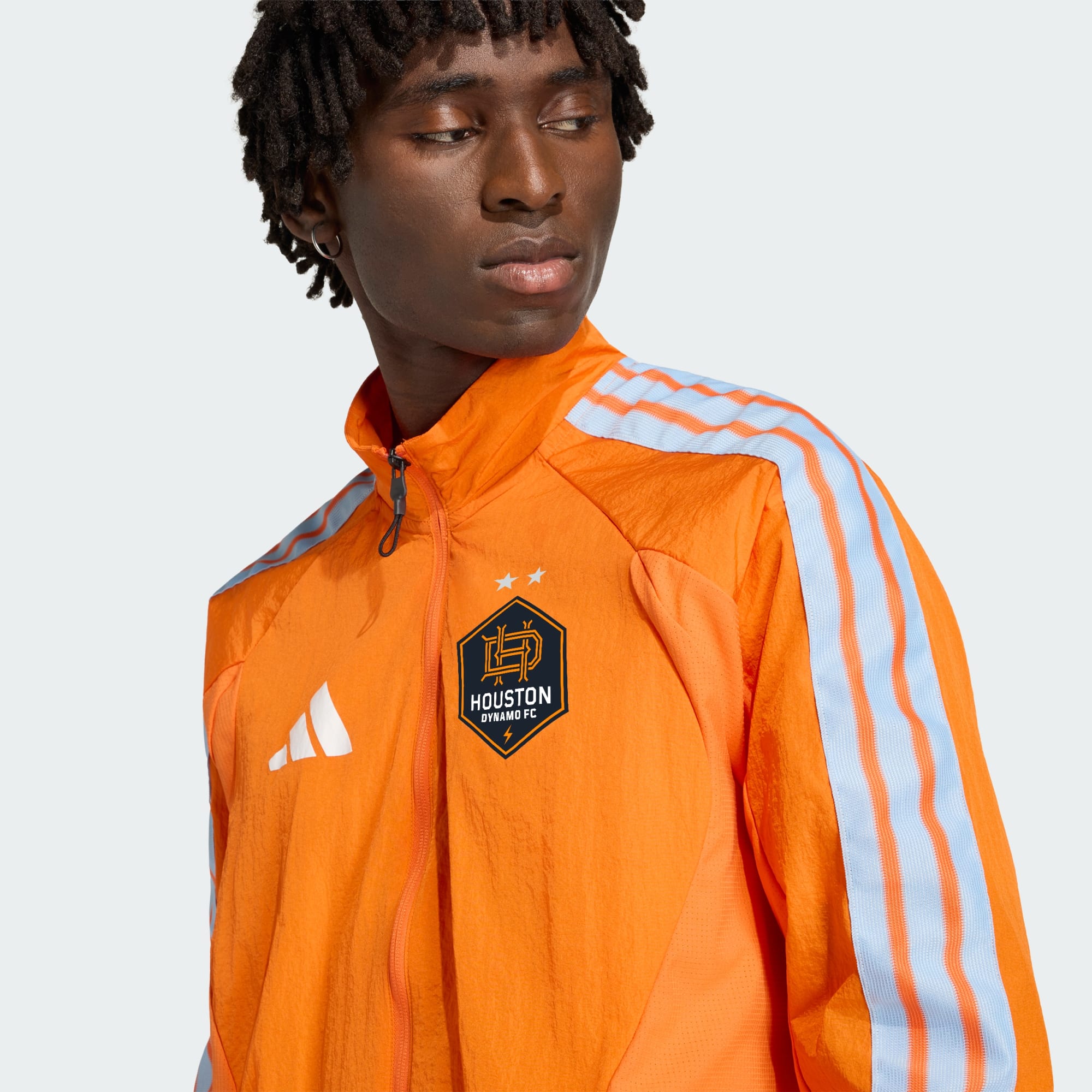 Celebrate the world of soccer culture with the Houston Dynamo Anthem Jacket. Inspired by the functional design of matchwear jerseys, it seamlessly blends performance with lifestyle, complementing your matchwear kit. Crafted with a shiny-touch fabric, this jacket offers a sleek and modern look that stands out off the field. The Performance branding and screen-printed club crest add an extra authentic touch, showcasing your support for Houston Dynamo. Designed for comfort and versatility, the regular fit brings ease of movement, while the stand-up collar and zipper closure provide a snug fit. Quality materials reflect our commitment to innovation and performance. Whether you're cheering from the stands or heading out for a casual day, this jacket is your go-to choice for soccer-inspired lifestyle wear. Embrace the spirit of the game and make a bold statement with adidas.